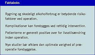 Alle, der arbejder med operationspatienter, vil møde patienter, der ryger eller drikker for meget og derfor bør tilbydes præoperativ forebyggelse. I dag må det anses for en kunstfejl at overse muligheden for, at patienterne kan spares for komplikationerne ved en rettidig indsats.