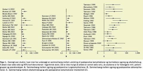 Ved alkoholrelaterede sygdomme og traumer har 5-50% af de kirurgiske patienter et skadeligt alkoholforbrug med den højeste forekomst hos mænd. Et særlig risikabelt forbrug ligger på fem genstande dagligt eller derover, idet komplikationsrisikoen hos disse patienter stiger med 300-400% (Figur 1C ), og efter større indgreb øges også dødeligheden, men også blot 3-4 genstande dagligt ser ud til at øge risikoen med om- kring 50% i forbindelse med store og mellemstore indgreb [2].