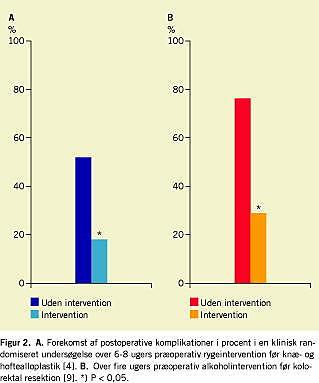 Et randomiseret studie med kolorektal kirurgi på 2 × 20 patienter, der havde et forbrug på 5-35 genstande dagligt, har vist, at blot fire ugers afholdenhed inden operationen optimerede immunberedskabet, hjerterytmen og stressreaktionen samt resulterede i signifikant færre kliniske komplikationer (Figur 2B ).