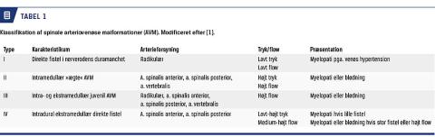 Spinal dural arteriovenøs fistel (SDAVF) er en sjælden, erhvervet lidelse i spinalkanalens karforsyning. Den er samtidig den hyppigste karmisdannelse i spinalkanalen og er væsentligt underdiagnosticeret i klinikken. SDAVF kan adskilles fra andre spinale arteriovenøse malformationer (AVM) (Tabel 1). I denne klassifikation benævnes SDAVF som spinal-AVM, type I [1].