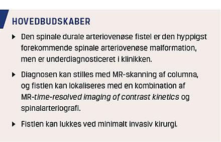 Formålet med denne artikel er at øge opmærksomheden på SDAVF og præsentere state of the art, hvad angår diagnose og behandling. I en nyligt publiceret kasuistik har man beskrevet en patient med SDAVF beliggende ved den kraniocervikale overgang [2], men denne artikel er så vidt vides den første samlede gennemgang af denne lidelse i dansksproget litteratur.