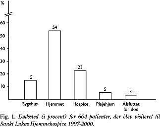 I 1997 døde i Danmark 58% af patienter med kræft som dødsårsag på sygehus og 25% i hjemmet, if. Sundhedsstyrelsens dødsårsagsregister. En engelsk undersøgelse viser, at flertallet af kræftpatienter ønsker at dø hjemme, hvis det er muligt (2). Også i Danmark er der en tendens til at bringe den uhelbredeligt syge og døden tilbage i familien og lokalsamfundet. Dette falder godt i tråd med WHO-definitionen på palliativ indsats, ifølge hvilken døden opfattes som en naturlig begivenhed (1).