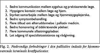 At dø i eget hjem er dog ikke nødvendigvis en garanti for et godt forløb. Det vil foruden patientens ønske og den professionelle indsats praktisk taget altid forudsætte tilstedeværelsen af en rask pårørende. Uanset dødsstedet vil den palliative indsats det meste af tiden skulle ydes i hjemmet, eventuelt afbrudt af kortere sygehusophold (3). Da der tilmed forventes en stigning i antallet af kræftdødsfald, foreløbig frem til år 2012 (4) står primærsektoren over for en voksende opgave. Denne løses i øjeblikket på varierende niveau, blandt andet afhængigt af strukturelle forhold og geografiske forskelle (by/land).