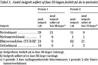Der blev i periode 1 foretaget i alt 125 transuretrale blæretumorresektioner, heraf var der 25 nydiagnosticerede tumorer, der blev behandlet med resektion, randombiopsier og resektionsfladebiopsi. Der var seks tilfælde af postoperative komplikationer (fire urinvejsinfektioner, en urosepsis og en postoperativ blødning, der førte til reoperation). Ingen af blæretumorresektionerne på nydiagnosticerede tumorer blev foretaget af 1. rese rvelægen, men en stor del af dem blev overværet af den uddannelsessøgende. I periode 2 blev der foretaget i alt 62 transuretrale blæretumorresektioner (reresektioner og resektioner af nydiagnosticerede tumorer) og heraf blev 34% (eller 42 pr. 12 mdr.) foretaget af fase III-lægen i urologi, alle under supervision (Tabel 1 ).