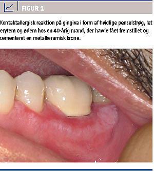 Koboltallergi ses hos ca. 1% af befolkningen og er ofte associeret med nikkel- og kromallergi [13]. Krom-kobolt-legeringer anvendes til fremstilling af både kroner og aftagelige proteser. Legeringerne anvendes i stigende grad til metalkeramiske kroner og broer, idet de udgør et alternativ til guld, både mht. materialeegenskaber og -pris [14]. Symptomerne kan variere fra en lokal reaktion i relation til restaureringen (Figur 1) til en diffus stomatitis.