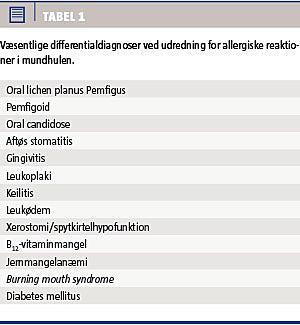 Endelig kan en fødevareallergi resultere i kontaktallergiske reaktioner i mundhulen, sædvanligvis i form af kløen og prikken i slimhinden, især i ganen, og hævelse af læberne ved eksposition for allergenet, f.eks. nødder og frugt. Ved persisterende, brændende og sviende symptomer i mundslimhinden, især tungen, og ingen væsentlige kliniske tegn bør diagnosen burning mouth syndrome overvejes. Denne tilstand forekommer hyppigst hos kvinder og debuterer typisk i 50-årsalderen [29].