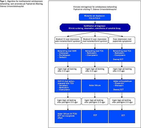 Som konsekvens af ovenstående udføres der for tiden lokale forsøg med implementering og kvalitetssikring af algoritmer for medikamentel antidepressiv behandling (Figur 1 ). Dette er blandt andet en stor hjælp ved uddannelse af yngre læger og plejepersonale og for de klinikere, som ikke har en optimal uddannelse i psykofarmakologi. I Figur 1 er angivet, at svær depression med psykotiske symptomer kan behandles med TCA alene. Vi er klar over, at dette er kontroversielt, og at evidensen inden for området er svag, men et af de nyeste arbejder om behandling af psykotisk depression støtter behandling med TCA alene [6].