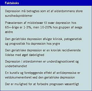 Depression er en kronisk recidiverende lidelse, og der er fundet en årlig incidensrate på 0,3-7% blandt 65+-årige, højest hos de ældste. Et gennemgående fund i ind- og udland er, at kun 10-20% er i relevant behandling [1, 2].