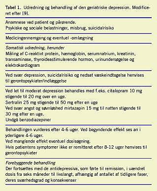 Citalopram og sertralin er de bedst undersøgte præparater ved GD og i modsætning til andre SSRI er der ikke problemer med interaktion. Ældre patienter skal behandles med samme doser af SSRI som yngre patienter (Tabel 1 ). Eneste alvorlige bivirkning er hyponatriæmi, og S-Na bør kontrolleres [1, 2, 9]. Ved svær angst, agitation og søvnløshed kan benyttes mirtazapin, men med forsigtig optrapning af dosis, idet den initiale sedation kan være et problem hos legemligt svækkede patienter. Behandling med benzodiazepiner har bivirkninger som faldtendens og pseudodemens og fører erfaringsmæssigt hurtigt til afhængighed hos depressive ældre, hvorfor benzodiazepiner bør undgås.