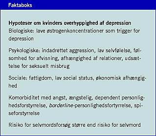 Depression er den samme sygdom hos mænd og kvinder, ligesom behandling og udbytte heraf er ens. Kvinders overhyppighed af unipolar depression i de fertile år er reel og er influeret af biologiske faktorer som følsomhed for stemningssvingninger i faser med faldende østrogenniveau, psykologiske træk som lav selvfølelse, reaktion på udsættelse for incest, komorbiditet med angst og indadrettet aggression samt sociale forhold med større afhængighed og hovedansvar for børn.