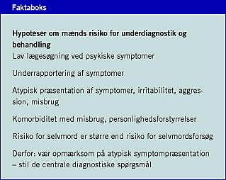 Underdiagnostik og behandling af mænd skyldes ringere lægesøgning og symptomrapportering. Komorbiditet med misbrug og personlighedsforstyrrelser bidrager hertil og medfører større risiko for selvmord, en risiko som også er øget hos depressive kvinder med misbrug. Opmærksomhed over for mænds måde at præsentere deres symptomer på er påkrævet.