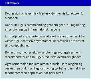 Depression en selvstændig risikofaktor for udvikling af IHD i mindst samme grad som hypertension, rygning og hyperkolesterolæmi og bør behandles aggressivt ligesom disse tilstande. Op mod en tredjedel af AMI-patienter har væsentlige depressive symptomer, og ca. en femtedel opfylder de diagnostiske kriterier for depression i forlængelse af et AMI. Denne gruppe patienter synes at have en mindst dobbelt så stor dødelighed som nondepresssive AMI-patienter, og de har samtidig nedsat evne til deltagelse i hjerterehabilitering, nedsat komplians i forbindelse med medicinsk behandling af IHD samt nedsat evne til at ændre på livsstilsfaktorer. Det er derfor vigtigt, at denne gruppe identificeres så tidligt som muligt i forløbet. Et øget samarbejde mellem almen praksis, kardiologien og psykiatrien omkring identifikation, eventuelt gennem anvendelse af simple spørgeskemaer, af denne gruppe patienter bør prioriteres. Behandling med SSRI-præparater synes at reducere overdødeligheden formodentligt gennem påvirkning af trombocytfunktionen. Der er dog ikke p.t. evidens for at behandle enten alle eller bestemte grupper af AMI-patienter med SSRI-præparater, således som det er fundet for apopleksipatienter [10]. I igangværende undersøgelser vil man dog belyse dette i løbet af de næste år.