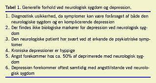 Depression forekommer hyppigt ved neurologisk sygdom og er en direkte eller indirekte følge af den strukturelle læsion eller de degenerative forandringer i cerebrum. Forskellige patofysiologiske forhold, komorbiditet, samtidig medikamentel behandling og kommunikationsproblemer gør det ofte vanskeligt at stille depressionsdiagnosen. Mange neurologiske symptomer kan forveksles med depressionssymptomer eller omvendt, og dermed er depressionsdiagnosen usikker (Tabel 1 ).