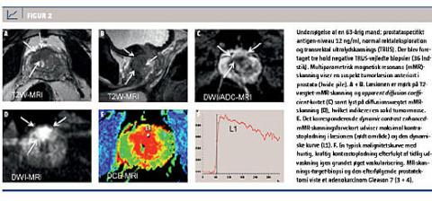 Brug af mMR-skanning af prostata forbedrer detektionen og lokaliseringen af signifikant PCa i forhold til brug af DRE og TRUS [3, 7]. Suspekte områder, der er set på mMR-skanning, inden man foretager TRUS-biopsi, kan udgøre specifikke bi opsimål – target-biopsier (Figur 2). Detektionsraten af PCa ved TRUS-rebiopsi kombineret med target-biopsi af mMR-skanningssuspekte foci er vist at variere mellem 21% og 40%; af dem blev 54% udelukkende fundet grundet mMR-skanning [8]. MR-guidede biopsier (MR-GB) kan også udføres direkte i MR-skanneren. Hos patienter, hvor man havde vedvarende klinisk cancermistanke pga. fortsat forhøjet PSA-koncentration trods mindst to hold negative TRUS-biopsier, fandt man ved MR-GB en PCa-detektionsrate på 59%, hvilket er usædvanlig høj [9]. Heraf var 93% signifikante tumorer vurderet ud fra Gleason-score (GS) ≥ 7, PSA-koncentration ≥ 10 ng/ml eller tumorvolumen ≥ 0,5 ml. MR-skanningsproceduren tog i gennemsnit 35 min med mediant fire indstik pr. patient mod 10-12 indstik ved standard-TRUS-rebiopsi. Metoder til at fusionere MR-billeddata med TRUS er under udvikling, således at det vil være muligt TRUS-vejledt at bioptere suspekte foci, der er set på mMR-skanninger, med større præcision.
