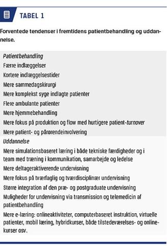 Tendenser i patientbehandlingen er beskrevet i Tabel 1 [1-3], og disse ændringer vil betyde færre indlagte patienter, der kan indgå i uddannelsesmæssige sammenhænge. Stuegangen som læringssted vil blive mindsket, og flere skal oplæres f.eks. i ambulatorier og med simulationsbaseret læring [3].