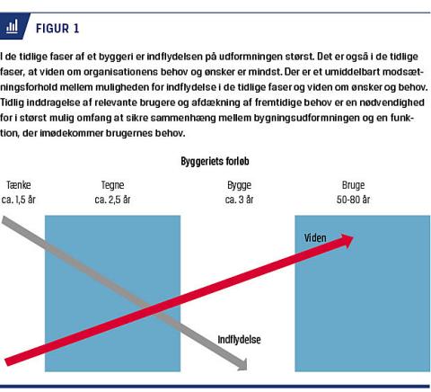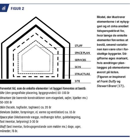 En forståelse for byggeprocessen er afgørende, idet indflydelsen på udformningen af det færdige byggeri kan ske i en relativ og kort fase tidligt i planlægningen (Figur 1). For byggeri er der beskrevet modeller for, hvor længe de enkelte dele af det forventes at bestå (Figur 2) [18]. Dvs. at det er væsentligt, at ideer og behov afdækkes i planlægningsfasen og indarbejdes tidligt, da risikoen ellers vil være, at man kun får minimal indflydelse på et byggeri, eller at ændringer bliver forbundet med store udgifter, da mere grundlæggende konstruktioner skal ændres [18].