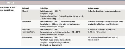 Hos ældre vil det yderligere være relevant at udvide definitionen til temperatur > 37,5 °C [3]. Durack et al foreslog i 1991 en ny definition [4], som siden har været almindeligt brugt [5] (Tabel 1). Denne definition inkluderer dog ikke de særlige forhold hos ældre.