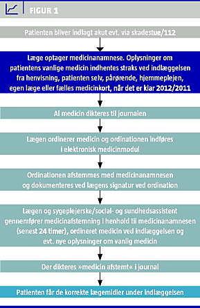 Summary There is an inconsistency between quality demands for medication reconciliation and the clinical reality Ugeskr Læger 2013;175(1):42-45 The purpose of medication reconciliation in the Danish Quality Model is "to ensure that patients receive the correct drugs at admission ...". This should be done by matching the patient's medication history with the prescribed medications to eliminate unintended inconsistencies. It lies in the procedure that the deficiencies in the medication history will be maintained by virtue of procedure. It is recommended to consider strategies and research for identifying effective processes to ensure the purpose.