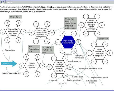 Figur 2 illustrerer som eksempel det udsnit af FRAM-modellen, der tager udgangspunkt i funktionen »lægen optager medicinanamnese«. Funktioner, der ved specifikationen viste sig at være relateret til »optagelse af medicinanamnese«, blev beskrevet som selvstændige funktioner som vist i Figur 2. Dette blev ligeledes gjort for de øvrige funktioner, der var beskrevet i sygehusets retningslinje (Figur 1), men disse dele af FRAM-modellen er ikke illustreret i artiklen. Det er ikke muligt grafisk at illustrere variabiliteten og den mere detaljerede beskrivelse og analyse i Excell-arkene. I det følgende beskrives de vigtigste resultater fra den samlede analyse med fokus på variabilitet og betydning for relaterede funktioner og i forhold til det tilsigtede resultat: at patienten får korrekte lægemidler.