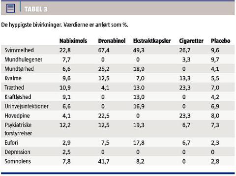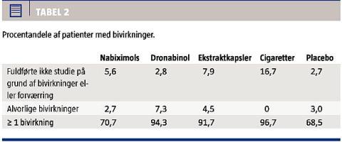 Der forekom 71 tilfælde af alvorlige bivirkninger [30] i cannabisgruppen (3,5%) og 33 tilfælde af alvorlige bivirkninger i placebogruppen (2,7%). Ingen patienter døde på grund af behandlingsrelaterede bivirkninger, og de fleste bivirkninger remitterede kort efter behandlingsophør eller dosisreduktion. Antallet af patienter, der havde bivirkninger, var højere ved behandling med dronabinol og ekstraktkapsler samt hos dem, der røg cannabiscigaretter, end i nabiximols- og placebogrupperne (Tabel 2).