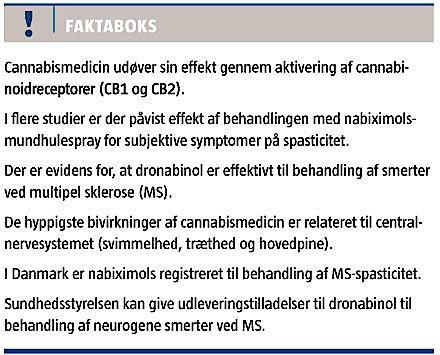 Der er klar evidens for, at cannabinoider har effekt ved symptomatisk behandling af MS. Statistisk signifikant effekt af behandlingen med nabiximolsmundhulespray blev påvist for subjektive symptomer på spasticitet (evidensniveau Ia-Ib). Der er også evidens for, at dronabinol er effektivt til behandling af neurogene smerter ved MS (evidensniveau Ib). Yderligere studier med evidensniveau Ia kunne være ønskværdige for at give en entydig konklusion vedrørende
