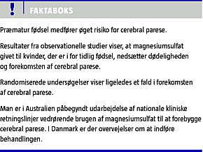 I både de observationelle og de randomiserede studier har man fundet, at præparatet signifikant mindsker risikoen for CP hos præmature (Tabel 1). Ydermere fandt man i de observationelle studier, at MgSO4 mindsker risikoen for død, mens man i de randomiserede studier ingen forskel fandt. I Australien er man på denne baggrund påbegyndt udarbejdelsen af nationale kliniske retningslinjer for brugen af MgSO4 . Her i landet anvendes MgSO4 derimod stadig kun til at forebygge eklampsi. Den afventende holdning kan skyldes usikkerheden angående administrationstidspunkt og den optimale dosis jævnfør Tabel 2, manglende klarlægning af maternelle bivirkninger, manglende biologisk plausibilitet samt usikker generaliserbarhed til danske forhold.