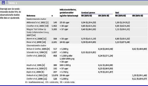 Sammenhængen mellem prænatal behandling med MgSO4 og risikoen for henholdsvis død og udvikling af CP hos barnet er undersøgt i såvel kohorte- som case-kontrol-studier. I studierne, der helt overvejende er amerikanske og fra 1990'erne, anvendte man MgSO4 på indikationerne neuroprotektion, tokolyse eller eklampsiprofylakse. I to studier af henholdsvis Schendel et al [3] og Nelson & Grether [4] undersøgte man brugen af prænatal behandling med MgSO4 som neuroprotektion og eklampsiprofylakse blandt børn med en fødselsvægt på under 1.500 gram. Schendel et al undersøgte en kohorte på 1.097 børn med opfølgning i tre- til femårsalderen, mens Nelson & Grether i et case-kontrol-studie undersøgte 117 toårige børn. De konkluderede begge på baggrund af multivariate analyser, at MgSO4 var associeret med en reduceret risiko for CP (Tabel 1 ).