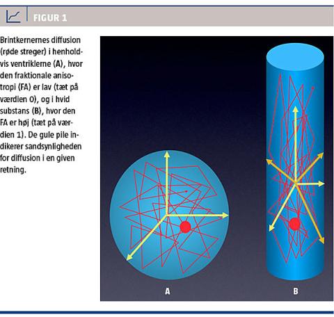 Integriteten af ledningsbanerne udtrykkes oftest i fraktional aniosotropi (FA). FA er et mål for graden af brintkernernes frie diffusion. Som en dråbe frugtfarve fordeler sig i et glas vand, kan vandmolekylerne i ventriklerne diffundere frit i alle retninger, kaldet isotrop diffusion. Modsat vil diffusionen være begrænset i områder med cellulær struktur og specielt i hvid substans, hvor strukturen er retningsbestemt. I ventriklerne vil FA være tæt på værdien 0, og i corpus callosum vil FA være meget høj (tæt på værdien 1) på grund af de tætte ledningsbundter (Figur 1). Kompromitteret mikrostruktur, f.eks. ved nedsat myelinisering, vil medføre en lavere FA-værdi. Foruden FA kan der estimeres værdier for blandt andet fibertæthed og aksontykkelse.