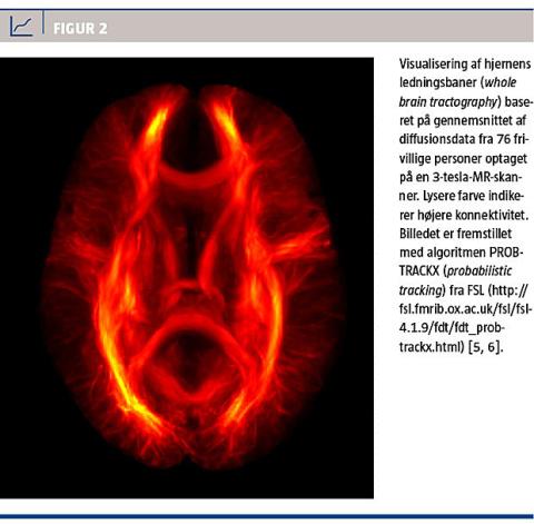 region of interest (ROI)-analyser). Endelig kan FA-værdierne anvendes til visualisering af hjernens ledningsbaner, f.eks. med traktografi (Figur 2).