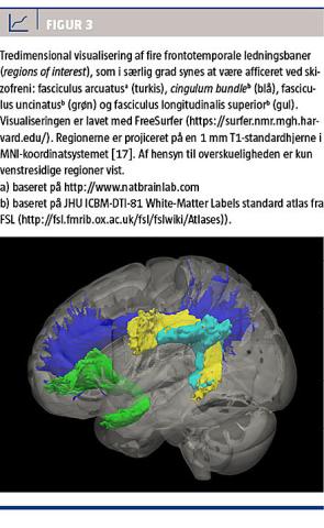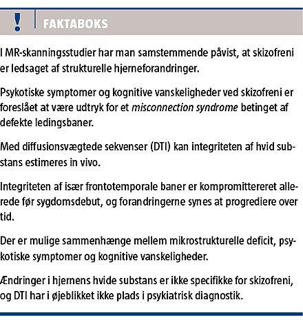 Skizofreni er en hjernesygdom, som er karakteriseret ved et spektrum af fundamentale ændringer i individets tænkning og forestillingsverden. Med udbredelsen af især MR-skanninger fra midten af 1980’erne [1] er det veletableret, at skizofreni er ledsaget af strukturelle hjerneforandringer [2]. Hidtidige MR-skanningsstudier af grå substans og ventrikelvolumen har bidraget væsentligt til forståelsen af sygdomsprogressionen og prognosen [3], men biologien bag sygdommens karakteristiske psykotiske symptomer er fortsat ufuldstændigt belyst.