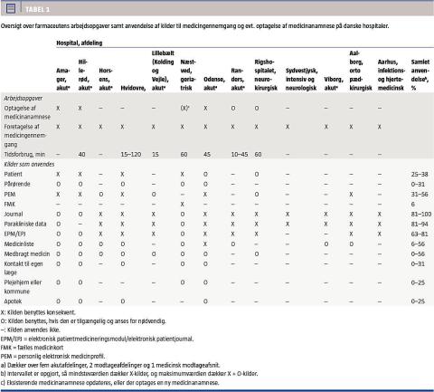 The objective of the article is to characterize the models used by pharmacists to obtain medication history and medication review in Danish hospitals. The models are characterized based on the sources used to create an overview of the patient‘s medication as well as the time spent per patient. Currently pharmacists perform medication review at 16 departments. The sources frequently used are the patient journal (81%) and clinical data (81%). The patient contributes to the medication review in 25%.