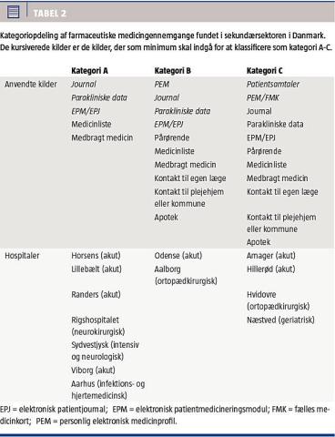 Tabel 2 viser, hvordan data fra hospitalerne fordeler sig i de tre kategorier, og det fremgår, hvilke modeller for medicingennemgang der anvendes på danske hospitaler. Tabellen viser, hvilke kilder der som minimum skal anvendes, for at modellen kan betegnes som enten kategori A, B eller C, og tydeliggør, hvilke fast anvendte kilder de enkelte kategorier har til fælles.