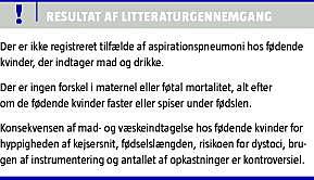 Formålet med denne statusartikel var at undersøge, om indtag af mad og drikke under en fødsel påvirker følgende: risikoen for aspirationspneumoni, fødselslængden, risikoen for dystoci, behovet for instrumentering, risikoen for kejsersnit, antallet af opkastninger samt det nyfødte barns Apgarscore.