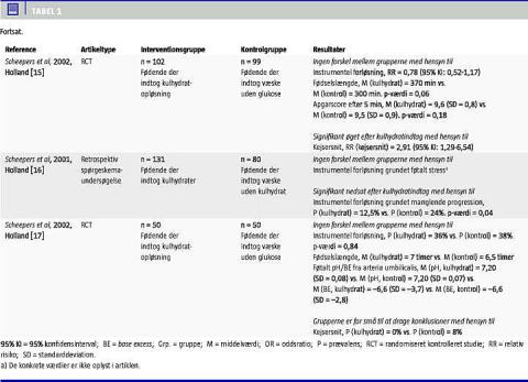 Scheepers et al [15] fandt i deres RCT signifikant flere kejsersnit i interventionsgruppen, 21 (21%), der havde indtaget kulhydratdrikke under fødslen, end i kontrolgruppen, syv (7%), der var fastende. I et andet RCT fandt man, at interventionsgruppen, der havde fået kulhydratdrikke, havde en lavere forekomst af kejsersnit, en (1%) versus syv (7%). Men denne forskel var ikke signifikant [14]. I alle de øvrige artikler fandt man ingen forskel i antallet af kejsersnit mellem de to grupper.
