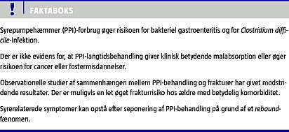 Sammenfattende synes der ikke at være evidens for, at langtidsbehandling med PPI giver klinisk betydende malabsorption, ligesom der ikke er holdepunkter for risiko for udvikling af neoplasi eller fostermisdannelser. Derimod synes der at være en veldokumenteret øget risiko for visse bakterielle gastroenteritter og for nosokomiel C. difficile -infektion.