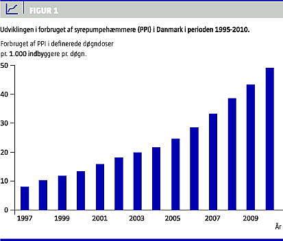 Forbruget af syrepumpehæmmere (PPI) er stadigt stigende. I løbet af de seneste fem år er forbruget steget fra 28,6 til 49,1 defineret døgndosis pr. 1.000 indbyggere/døgn (Figur 1 ). I 2010 indløste ca. 9% af danskerne mindst én recept på PPI. Mens incidensen af nye behandlinger med PPI er stabil, stiger langtidsforbruget markant uden kendt årsag. Særlige forhold gør sig gældende ved langtidsbehandling, hvor syresekretionen nedsættes, og gastrisk pH ændres i længere tid. Kan det langvarige, ufysiologisk høje pH have negativ indflydelse på absorptionen af vitaminer og mineraler samt på modstandsdygtigheden over for infektioner, og kan den ændrede feedbackregulering af syresekretoriske hormoner føre til uhensigtsmæssigt høje hormonspejl og deraf følgende trofiske eller neoplastiske effekter? Formålet med denne statusartikel er at sammenfatte, hvilke komplikationer der er evidens for hos patienter, der behandles med PPI i længere tid.
