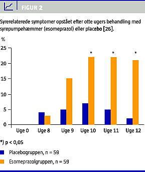 I to studier har man påvist en øget forekomst af syrerelaterede symptomer hos raske forsøgspersoner efter seponering af PPI [26, 27]. Reimer et al [26] undersøgte den kliniske betydning af syre-rebound hos 119 asymptomatiske deltagere i et kontrolleret forsøg, hvor forsøgspersonerne blev randomiseret til behandling med PPI i otte uger efterfulgt af blindet skift til placebo i fire uger eller til placebo i alle 12 uger. Signifikant flere forsøgspersoner i PPI-gruppen end i placebogruppen rapporterede om syrerelaterede symptomer efter seponering (Figur 2 ) (26/59 vs. 9/59; p < 0,001). Symptomerne opstod oftest 1-2 uger efter, at behandlingen var seponeret, og varede i gennemsnit 4,7 dage.
