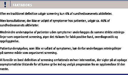 I denne artikel giver vi eksempler på sådanne undersøgelser i det danske sundhedsvæsen. Vi diskuterer også, hvad der skal forstås ved screening. Det er vores tese, at der i virkeligheden foregår langt flere aktiviteter i sundhedsvæsenet med karakter af screening end det, vi normalt sammenfatter under begrebet. Der knytter sig guidelines med særlige metodologiske og etiske krav til screeningsundersøgelser [1], og man må overveje, om det ikke er krav, som altid skal opfyldes, når man undersøger for sygdom hos patienter uden symptomer.