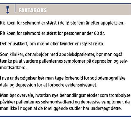 er øget, også selvom patienterne ikke lider af depression. 3) Særlig opmærksomhed bør rettes mod den yngste gruppe af patienter i de første fem år efter apopleksidiagnosen, da det er her, der er størst risiko, også selvom patienterne ikke lider af depression. 4) For yderlige belysning af området mhp. præventive tiltag kan det anbefales at udføre større registerstudier og herunder tage højde for konfoundere og længden af opfølgning efter det første apopleksitilfælde.