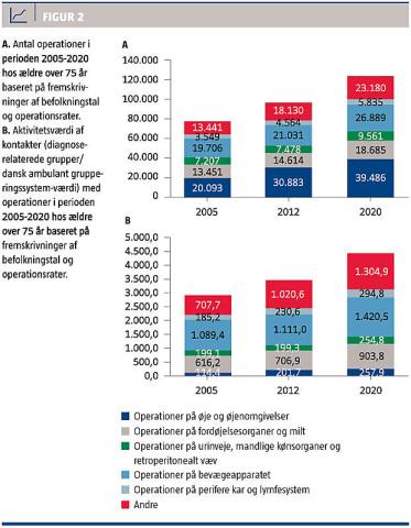 årligt på baggrund af fordelingsregnskaber fra de danske offentlige hospitaler. I de tilfælde, hvor der er foretaget operationer med involvering af flere kirurgiske specialer i samme kontakt/forløb (2,7% af kontakterne), blev værdien af den pågældende kontakt divideret med antallet af specialer, således at den samlede værdi ikke oversteg det samlede takstgrundlag. Taksterne blev herefter blevet indekseret til 2013-priser ved hjælp af den officielle pris- og lønfremskrivning for perioden [4]. Fremskrivningerne af operationerne til 2020 blev udregnet ved at gange operationsraterne for de forskellige specialer pr. 1.000 borgere over 75 år for 2012 med det fremskrevne antal borgere over 75 år for det pågældende år.