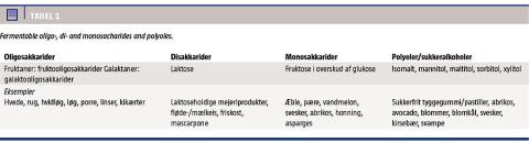 Behandlingen er begrænset, alene symptomatisk og omfatter blandt andet kost- og livsstilsændringer. Flere diætetiske tiltag er blevet undersøgt med varierende resultater [5]. I de senere år har fokus været rettet mod den såkaldte low-FODMAP-diæt (LFD). FODMAP er et akronym for en gruppe af fermenterbare kortkædede kulhydrater: fermentable oligo-, di- and monosacharides and polyoles (Tabel 1).