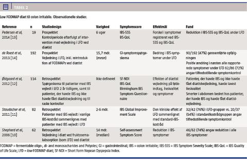 I tre retrospektive studier har man opgjort effekterne af diætvejledning i LFD ved IBS [10-12] (Tabel 2).