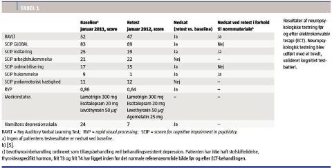 Resultaterne viste nedsat funktion på hukommelse, indlæring, koncentration og globalt funktionsniveau (Tabel 1), men bedring af depressionen sammenlignet med initialtilstanden.