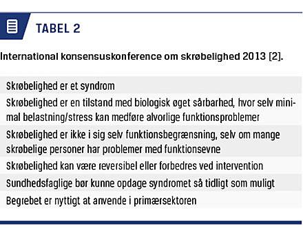 Der er beskrevet mere end 25 modeller, og der har været en del akademisk diskussion om, hvilke kliniske områder som skulle indgå i definitionen [1, 5, 11, 12]. En præcis afgrænsning er endnu ikke opnået, men på en international konsensuskonference om skrøbelighed i 2013 opfordredes man til at være mere aktiv for at identificere, diagnosticere og behandle syndromet, uanset hvilken model man anvendte (Tabel 2).