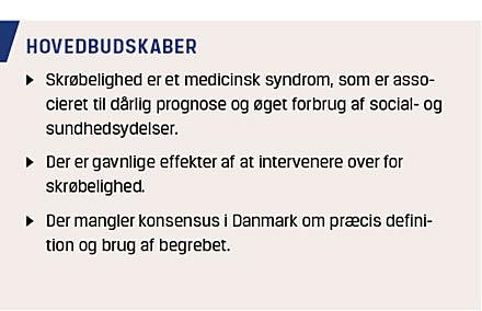 Emerging evidence demonstrates the value of frailty as a predictor of adverse outcomes in older persons. Identi­fi­cation of early stages of frailty offers the opportunity to reverse the development of frailty through targeted inter­ventions. Awareness of the vulnerability in frailty can guide appropriate counselling of patients and their families when considering medical interventions. Recognition of frailty may also help identify and optimize the management of co­existing conditions. There is a lack of consensus in Denmark to use frailty and how to best identify, assess and diagnose frailty.