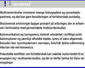 Forfatterskab - hvem der skal stå hvor i et manuskripts byline og hvorfor - kan give anledning til diskussioner og uenigheder. Ved multicenterstudier er der et relativt større antal bidragsydere og samarbejdspartnere end ved andre typer studier, og dermed øges risikoen for konflikter om forfatterskab. Forskning foregår i tiltagende grad på tværs af nationaliteter, centre og institutioner, men potentielle konflikter om forfatterskab kan virke demotiverende/afskrækkende i forhold til at starte og gennemføre multicenterstudier [1-3]. Dette er en potentielt alvorlig sag, idet denne type studier generelt er af høj videnskabelige kvalitet, ikke mindst på grund af de bedre vilkår for både inklusion af forsøgspersoner og ekstrapolering af resultater.