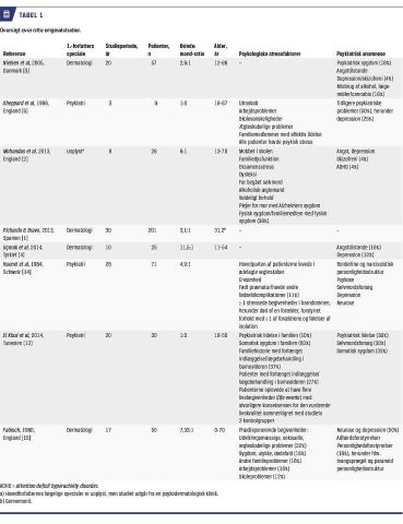 Patienter med dermatologiske lidelser har generelt overhyppighed af psykisk sygdom [16, 17], således også patienter med DA (Tabel 1). I et nyere retrospektivt studie fandt man blandt 28 personer, som opfyldte kriterierne for DA, at 46% af dem havde samtidig psykisk sygdom, heraf havde 36% angst, depression eller reaktion på alvorlige tab [2]. Dette viser, at det er vigtigt, at man ved vurderingen af patienten, som man formoder har DA, interesserer sig for de bagvedliggende psykiske og psykosociale belastninger. Hudskaderne frembringes enten fuldt bevidst eller, hvis skaderne påføres, mens patienten er i en dissociativ tilstand, undertiden ubevidst. Patienter med DA kan typisk ikke forklare læsionernes opståen – »de er bare kommet« – og benægter ihærdigt egen rolle i fremkomsten af dem [7]. I modsætning til patienter som »simulerer«, er hensigten bag adfærden ikke at opnå materiel gevinst eller ansvarsfralæggelse, men snarere at opnå opmærksomhed og omsorg.