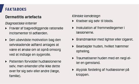 Dermatitis artefacta (DA) er en lidelse, hvor patienten mere eller mindre tilsigtet påfører sig selv hudforandringer ved at ætse, brænde, skære eller på anden vis beskadige huden. DA er et symptom på en bagvedliggende psykiatrisk lidelse eller psykosocialt stress. Formålet med denne artikel er at bidrage med opdateret viden om DA, herunder klinisk præsentation og diagnostik, psykiske og psykosociale aspekter samt behandlingsmuligheder.