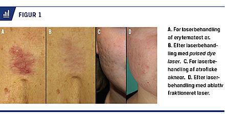 I Figur 1 C ses atrofiske aknear, og Figur 1 D aknear, som er blevet behandlet med AFL. Ved gennemgang af den eksisterende litteratur fandt vi to RCT, hvor man sammenlignede laserbehandling af atrofiske aknear med ubehandlede kontrolar. I det ene studie benyttede man NAFL og fandt ved blindet evaluering af tekstur på en tipointskala en signifikant forbedring af de behandlede ar (p = 0,03), men ingen effekt på farveforandringer [17].
