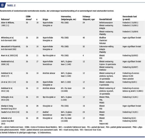 Der er fundet 12 RCT, hvori man har dokumenteret effekten af laser til behandling af ar. Området bærer dog fortsat præg af at være nyt, og generelt er studierne for heterogene til at blive sammenlignet. Der mangler således ensartede retningslinjer for studiesetup, evalueringsværktøj og followuptidspunkter, så studierne kan sammenlignes i et større perspektiv.